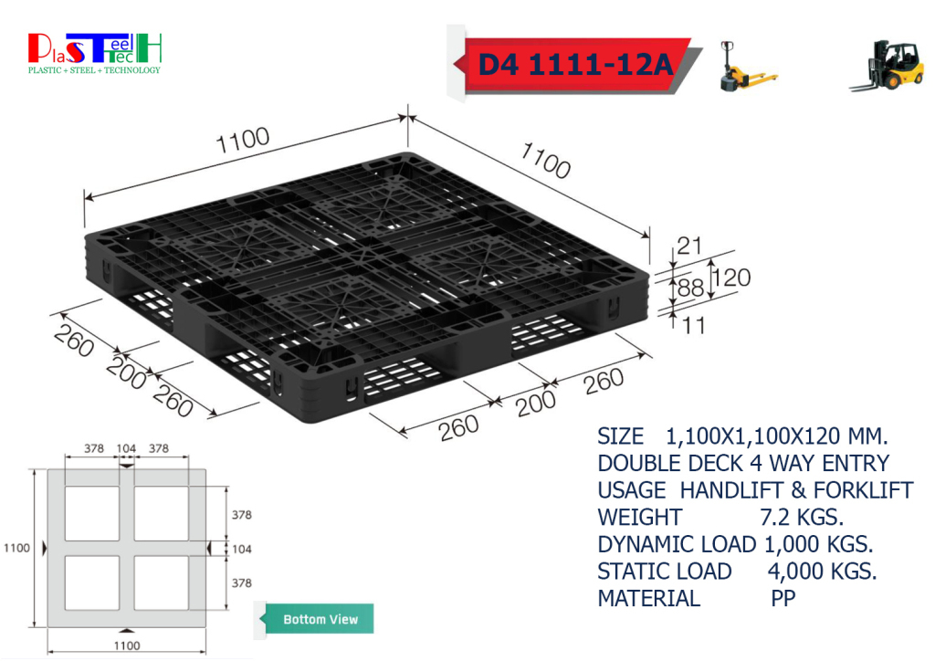 1,100×1,100×120 mm พาเลทพลาสติก วันเวย์