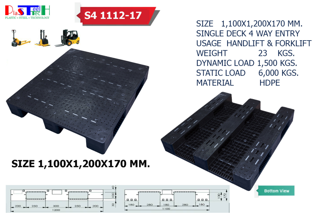 1,100×1,200×170 mm พาเลทพลาสติก หน้าเรียบ ขา E