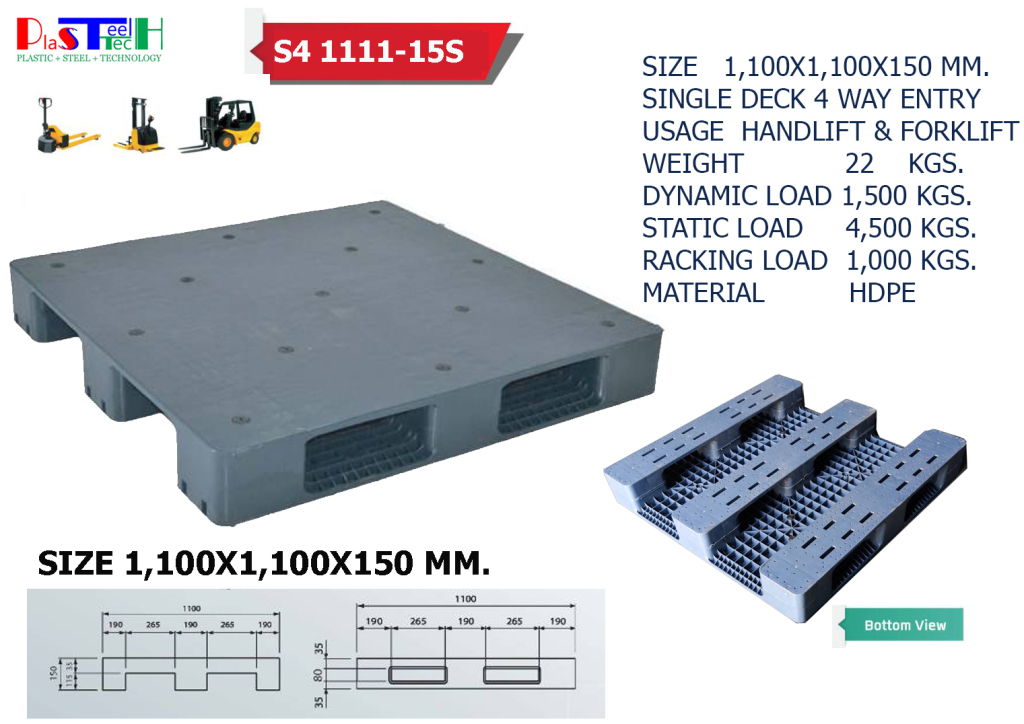 1,100×1,100×150 mm พาเลทพลาสติก หน้าเรียบ ขา E
