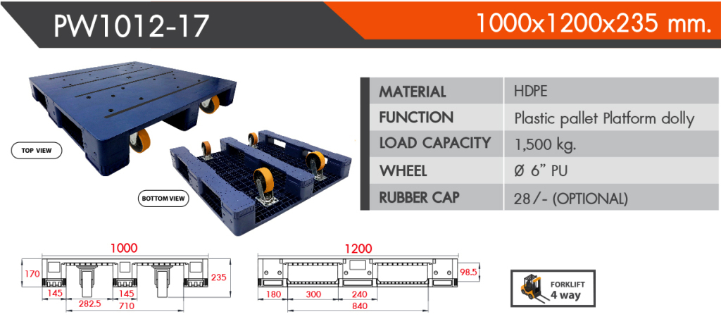 1,000×1,200×235 mm พาเลทพลาสติกติดล้อ
