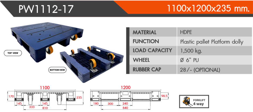 1,100×1,200×235 mm พาเลทพลาสติกติดล้อ